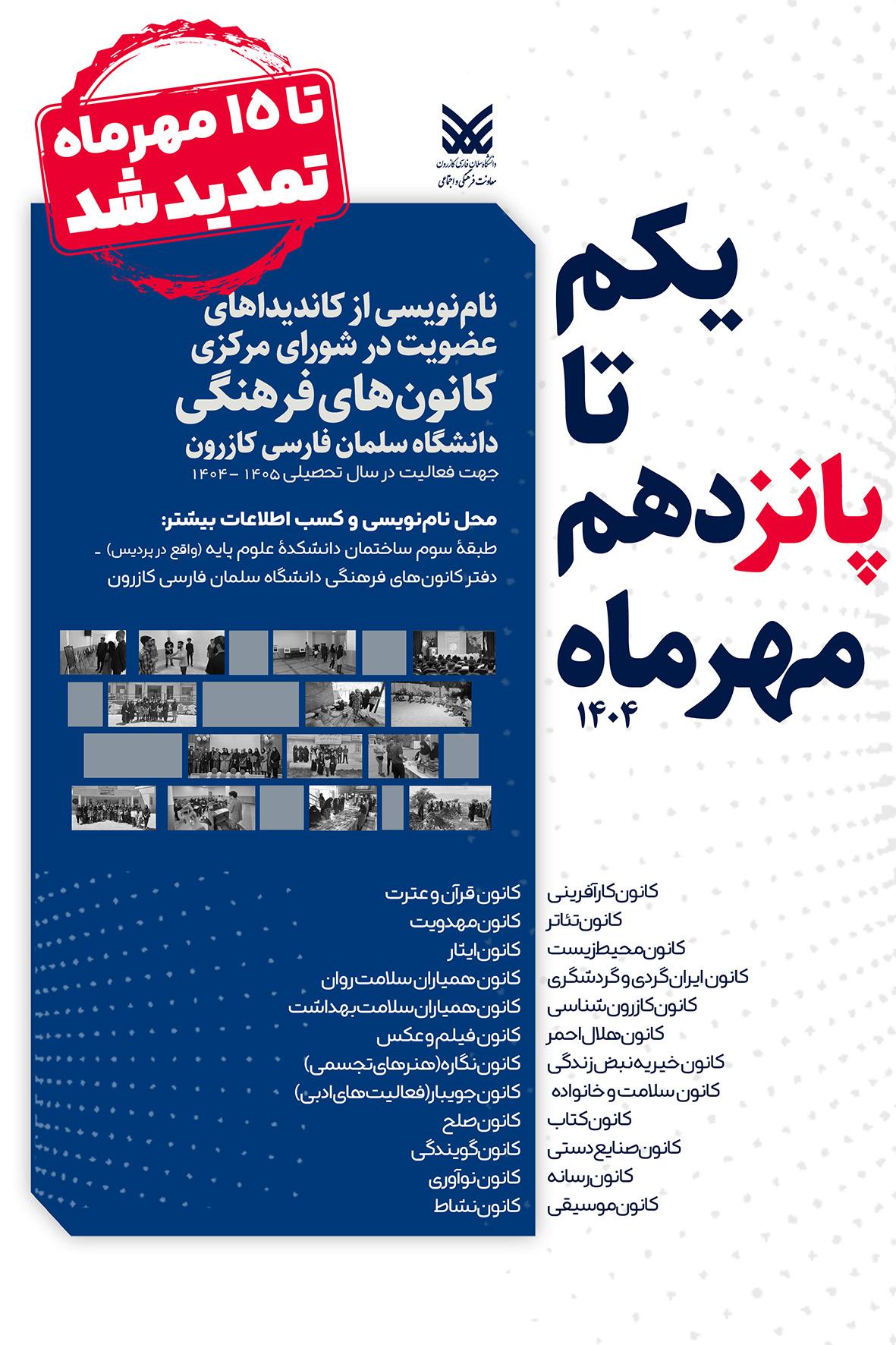 فراخوان نامنویسی کاندیداهای عضویت در شورای مرکزی کانونهای فرهنگی دانشگاه سلمان فارسی کازرون