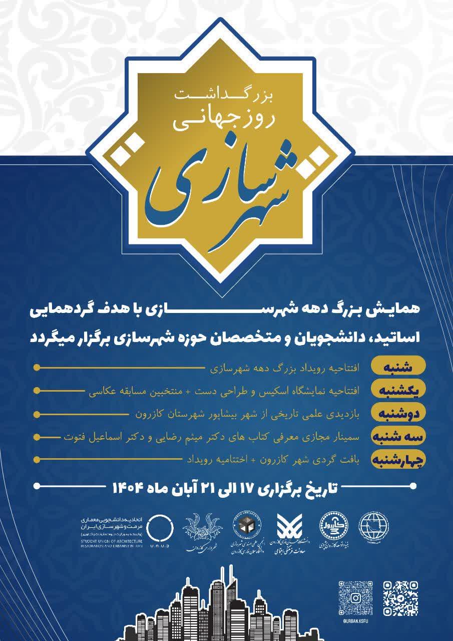 به مناسبت روز جهانی شهرسازی و سومین سمپوزیوم ملی - دانشجویی شهرسازی در دهه شهرسازی، اتحادیه انجمنهای علمی دانشجویی معماری، مرمت و شهرسازی ایران و انجمن علمی دانشجویی مهندسی شهرسازی دانشگاه سلمان فارسی کازرون برگزار مینمایند.