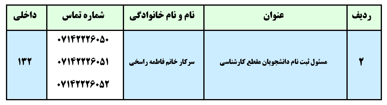 در صورت نیاز به کسب اطلاع از موضوع ثبتنام لازم است مطابق با جدول زیر با مسئول ثبت نام تماس حاصل شود.