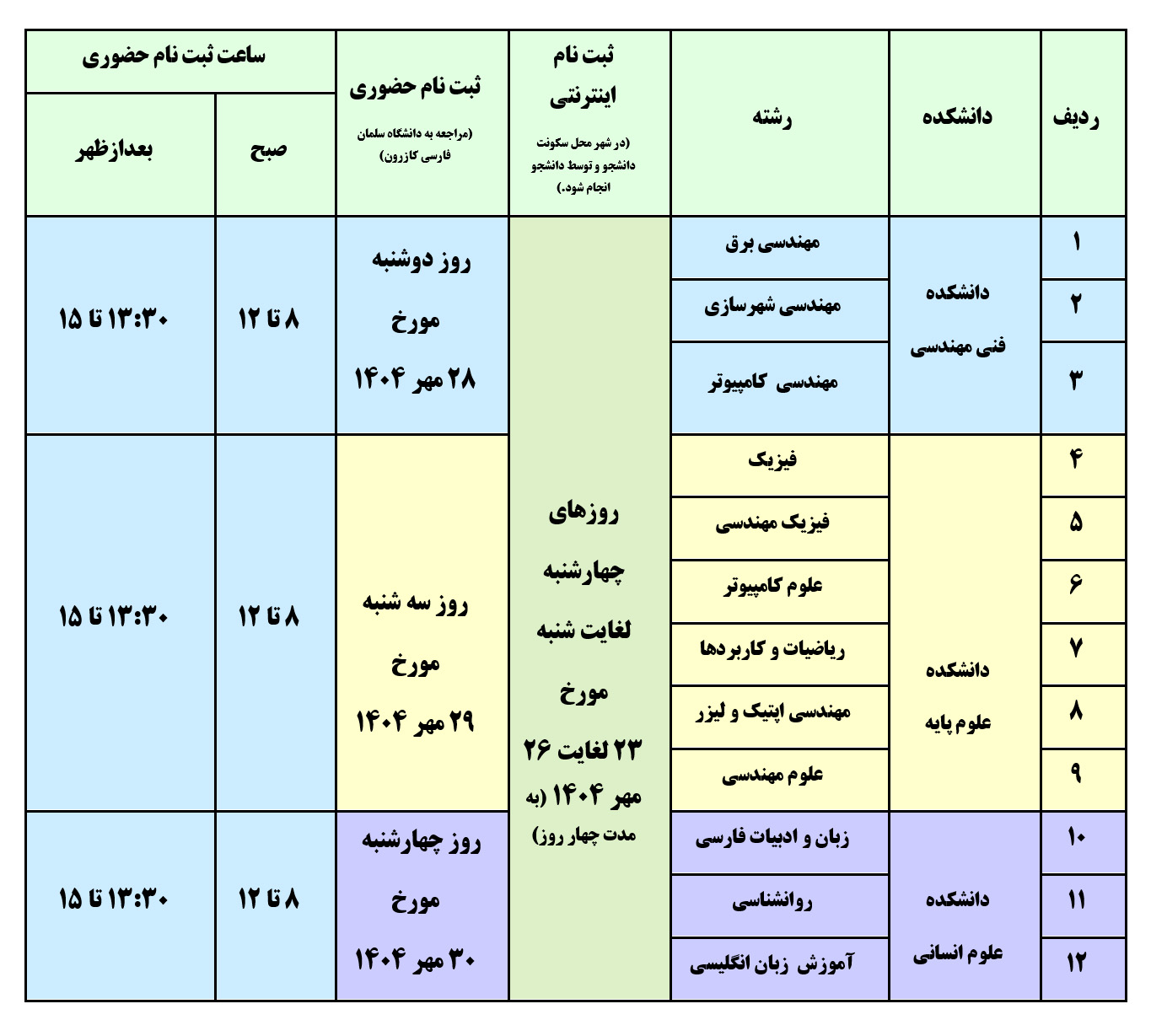 متقا ضی موظف است بعد از انجام ثبت نام اینترنتی اصل وکپی برابر با اصل مدارک درخواستی(در بالای اطلاعیه ذکر شده است) را براساس رشته قبولی و زمانبندی جدول زیر با مراجعه به ساختمان مرکزی دانشگاه سلمان فارسی کازرون واقع در خیابان آیت الله طالقانی به مسولان ثبت نام تحویل دهد.(آدرس دانشگاه : استان فارس- شهرستان کازرون–چهار راه ارشاد – ابتدای خیابان آیتالله طالقانی – دانشگاه سلمان فارسی کازرون)